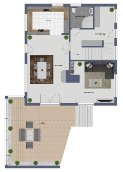 Das neuwertige Haus erstreckt sich über drei Etagen – Keller, Erdgeschoss und Obergeschoss – und beeindruckt mit einer offenen Wohnküche, einem geräumigen Esszimmer. Von der Küche führt eine Tür direkt auf die Westterrasse, während das Esszimmer einen wundervollen Übergang zur Südterrasse und in den üppigen Garten bietet. Der Garten selbst ist eine Oase mit bunten Pflanzen, einer gemütlichen Pergola, Obstbäumen und Sträuchern, die sich Richtung Nordosten erstrecken.