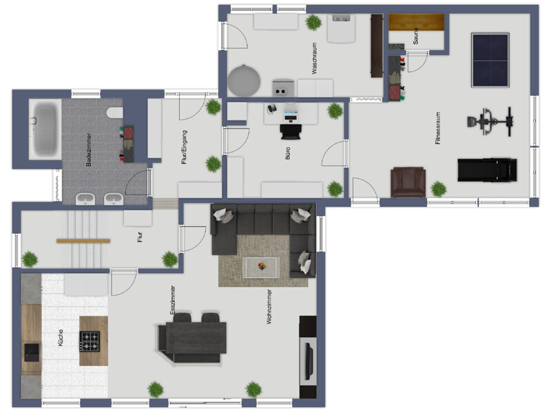 Im Erdgeschoss erwartet Sie eine geräumige Diele, eine wunderschöne, moderne Einbauküche und ein großzügiges, offenes Wohnzimmer, das zum Verweilen einlädt. Ein Zimmer sowie ein stilvoll ausgestattetes Badezimmer mit Badewanne und WC sowie ein praktischer Wintergarten/Fitnessraum mit Sauna bieten zusätzlichen Komfort. Zwei Terrassen (Ost- und Süd-Ausrichtung) erweitern den Wohnraum und laden zum Genießen der Sonne ein.