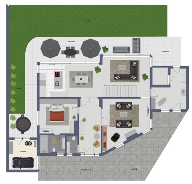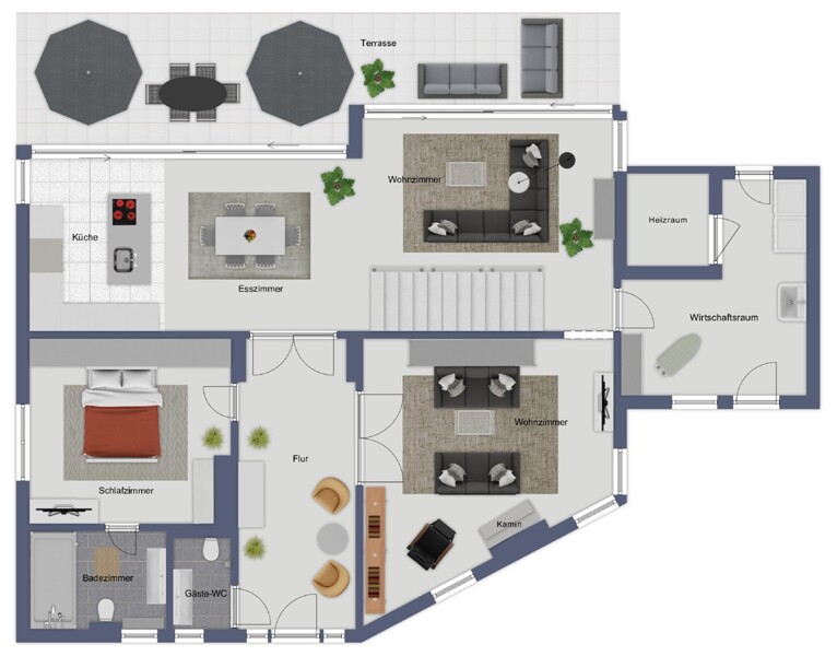 Im Erdgeschoss erwartet Sie ein großzügiges Gästezimmer mit eigenem Duschbad und Toilette, das höchsten Komfort bietet. Ein separates Gäste-WC ist im Eingangsbereich vorhanden. Besonders praktisch ist der große Hauswirtschaftsraum, der direkt von außen zugänglich ist und damit die tägliche Organisation erleichtert. Alle Zugänge sind mit modernster Sicherheitsstufe versehen und eine technische Sicherheitsanlage sorgt für zusätzlichen Schutz.