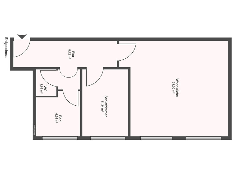 Die Wohnfläche von 58 m² ist durchdacht geplant und umfasst einen einladenden Eingangsbereich mit Diele. Der anschließende Zugang führt zu einem modernen Badezimmer, das sowohl mit einer erstklassigen Dusche als auch einem entspannenden Whirlpool begeistert. Ein separates Gäste-WC ist ebenfalls vorhanden.