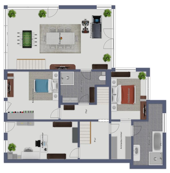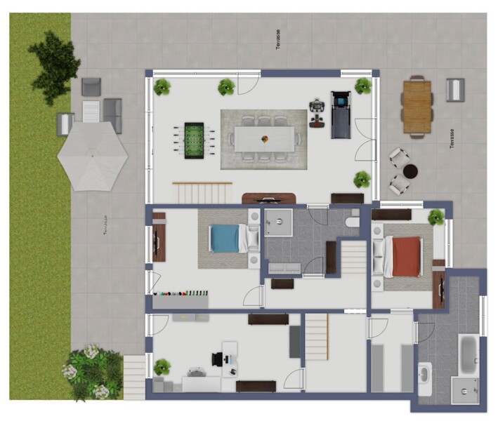 | Bad | WC, Dusche und Wanne, Bidet, Pissoir, Fenster, Doppelwaschtisch, Handtuchtrockner |