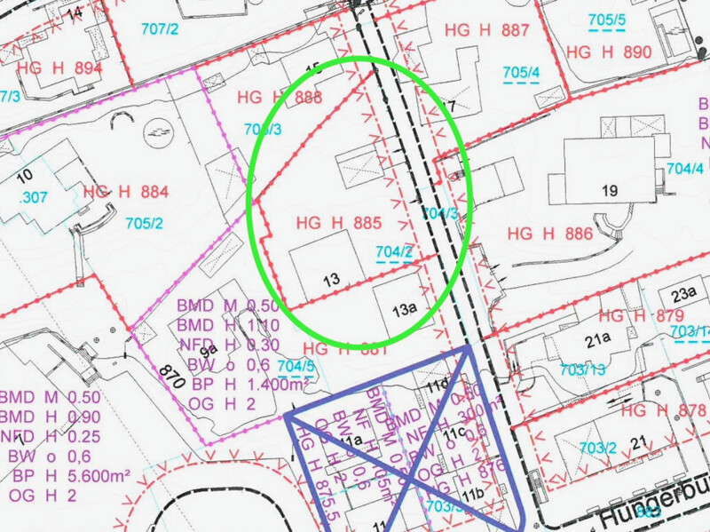 Das Grundstück erstreckt sich über ca. 886 m². Es handelt sich um einen Anteil als rechtliches Wohnungseigentum von ca. zwei Dritteln am Gesamtgrundstück mit 1.366 m². Die restliche verbleibende Fläche ist im Besitz eines weiteren Miteigentümers, auf dessen Teil ein zwanzig Jahre altes Einfamilienhaus steht.