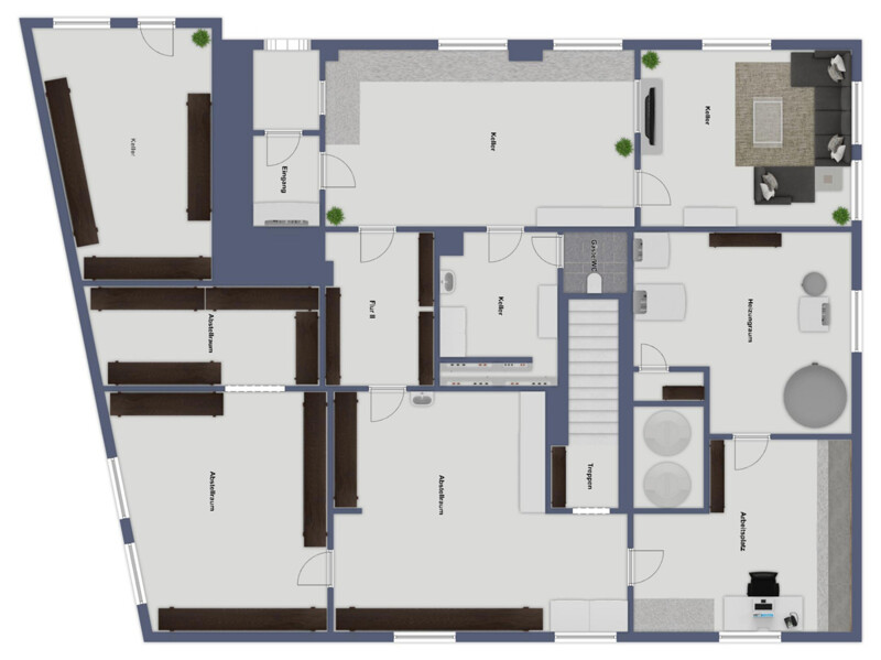 Das Büro im Keller ist bereits mit einer Isolierung sowie einer Heizung ausgestattet. Im 1. Obergeschoss kann eine zusätzliche Küche und ein weiteres Bad realisieret werden, die Leitungen sind nämlich schon vorhanden.