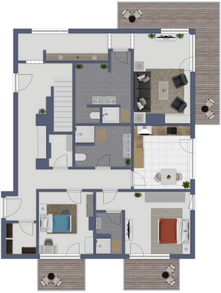 Auf insgesamt Zwei Etagen präsentiert die Wohnung vier geräumige Schlafzimmer und drei moderne Badezimmer, wobei Ihnen die Freiheit geboten wird, die Badezimmer nach Ihrem eigenen Geschmack zu gestalten. Für zusätzliche Bequemlichkeit steht ein Gäste-WC zur Verfügung. Die Auswahl aus edlen Holzdielen und stilvollen Fliesenböden verleihen der Wohnung Eleganz und Wärme und können nach Ihren individuellen Wünschen angepasst werden.