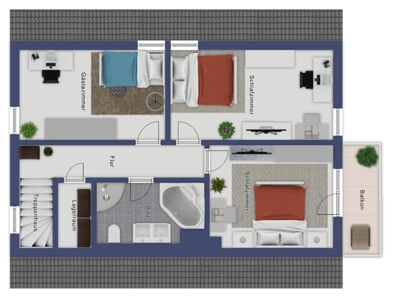 Im Dachgeschoss stehen drei Schlafzimmer sowie ein grosszügiges Tageslichtbad mit Eckbadewanne, Dusche und Doppelwaschbecken zur Verfügung. Ein weiteres Highlight ist der zweite überdachte Balkon, der von einem der Schlafzimmer aus begehbar ist – perfekt, um nach einem erfolgreichen Arbeitstag bei einem Glas Rotwein zur Ruhe zu kommen.